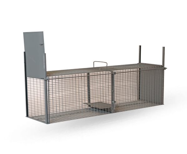 Cage grillagée avec une bascule à contrepoids. Renfort par armatures, grillage en mailles soudées, armatures et grillage en fil galvanisé.